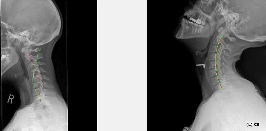 On the LEFT is a patient who presented with a reversal of their neck curve. This has been associated with many symptoms including headaches, pain, weakness, and numbness. It is also been shown to lead to early spinal degeneration and arthritis.